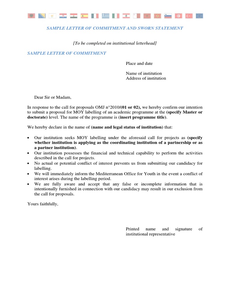 Letter of commitment sample. Sample commitment letter [fill in highlighted/italicized areas with specific information] [on letterhead of partnering organization] project director applicant organization city, state. (this letter can be used for boards of directors, committees, and working groups. Sample letter of commitment this is a sample letter of commitment that can be adapted for local use.